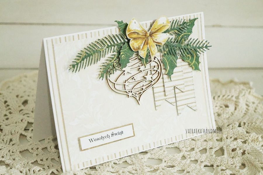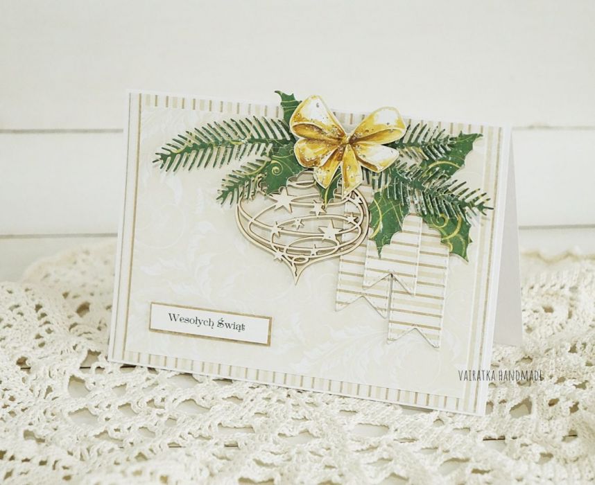 Kartka świąteczna ozdobiona ażurową tekturową bombką i kompozycją z zimowych listków. Wewnątrz miejsce na wpisanie życzeń. W komplecie z kopertą. Rozmiar 10,5x15cm
