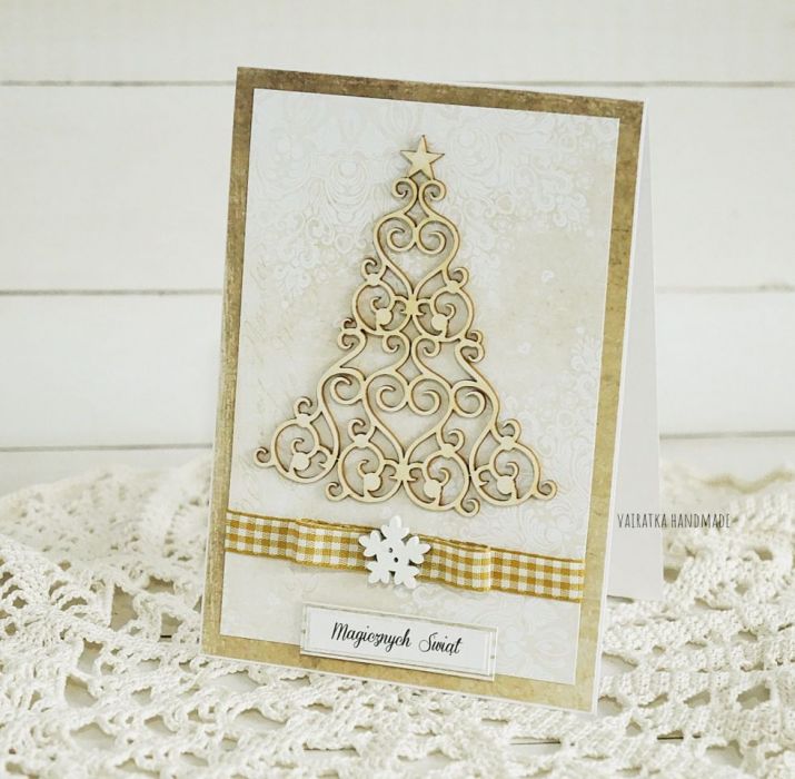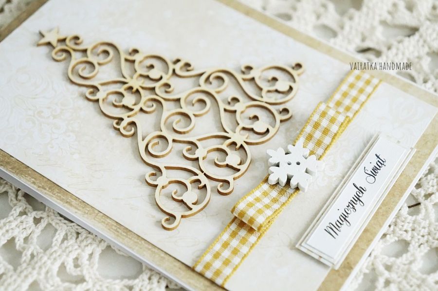 Kartka świąteczna ozdobiona tekturową ażurową choinką oraz wstążką i drewnianą gwiazdką.