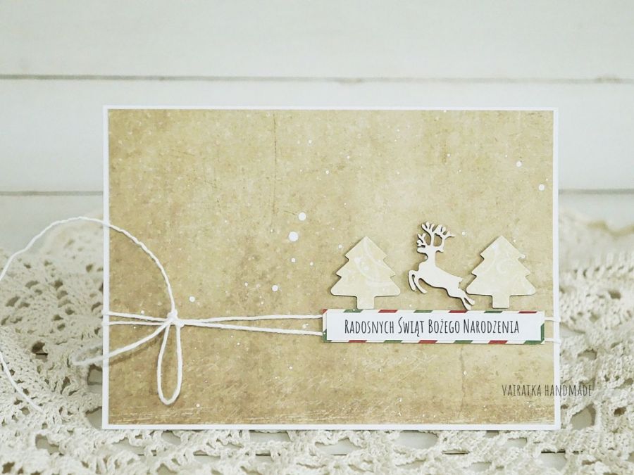 Kartka świąteczna w stylu eco, ozdobiona lnianym sznurkiem, chlapaniami farbą akrylową. Rozmiar 10,5x15cm (C6), w komplecie z kopertą. Cena dotyczy jednej sztuki