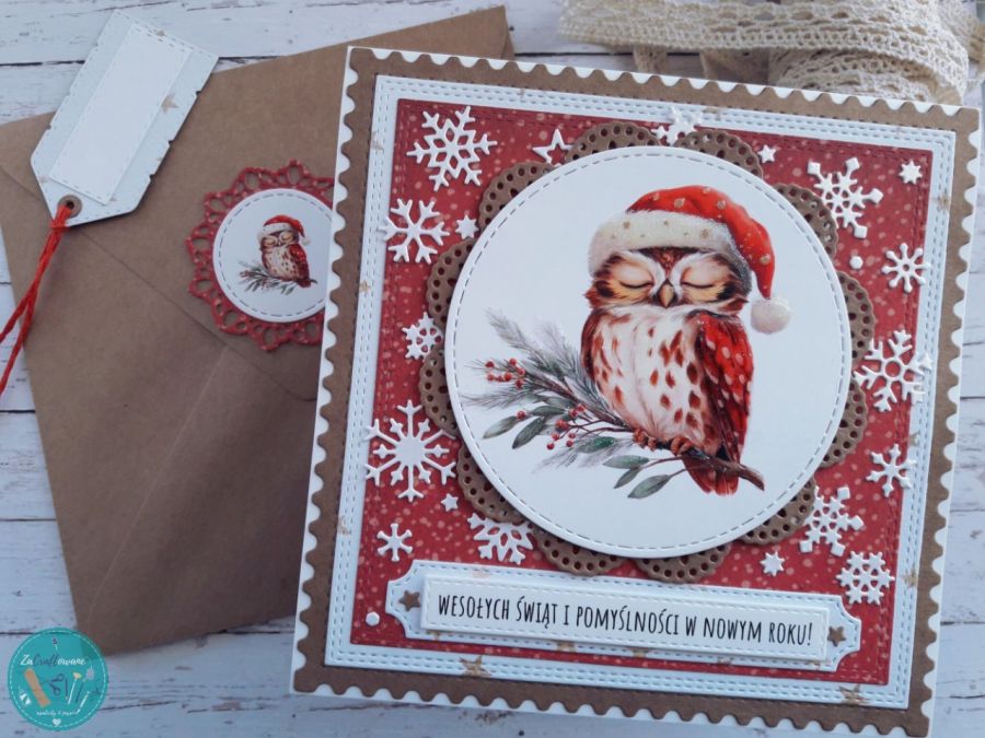 Kartka bożonarodzeniowa z sową wykonana metodą scrapbookingu z wykorzystaniem profesjonalnych materiałów i z dbałością o każdy szczegół.