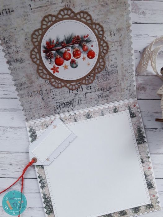 Wnętrze i tył kartki także zostały ozdobione. Śnieżynki są wycięte z kremowego papieru z delikatnym perłowym połyskiem. Grafika jest wykończona preparatem szklącym i brokatem, dzięki czemu całość, mimo naturalnego wyglądu, będzie się pięknie mienić w blasku światełek choinki.