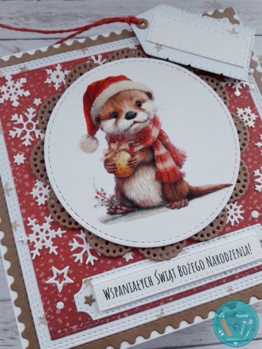 Kartka bożonarodzeniowa z wydrą wykonana metodą scrapbookingu z wykorzystaniem profesjonalnych materiałów i z dbałością o każdy szczegół.