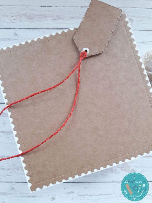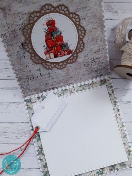 Do kartki dołączam GRATIS w postaci widocznej na zdjęciu etykietki, za pomocą której można podpisać prezent dla osoby obdarowywanej świątecznym upominkiem i przyczepić ją do wstążki, którą obwiązany jest podarunek, za pomocą sznureczka, który również znajduje się w zestawie.