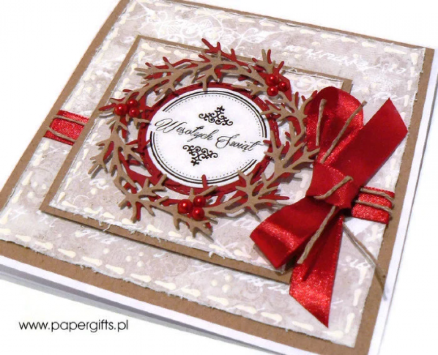 Zadaj pytanie dotyczące produktu: Kartka świąteczna zimowy wianek z czerwoną kokardą