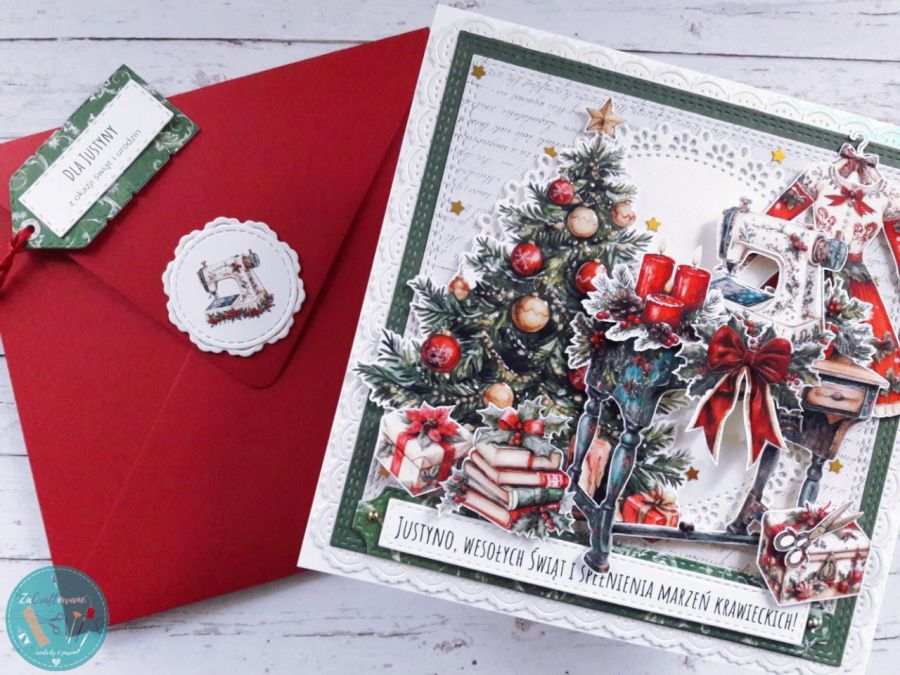 Motywem głównym kartki są święta Bożego Narodzenia w pracowni krawieckiej, gdzie stworzony jest iście bożonarodzeniowy klimat do tworzenia świątecznych kreacji. Kartka sprawdzi się idealnie jako podarunek dla krawcowej, która obchodzi urodziny w okresie świątecznym.