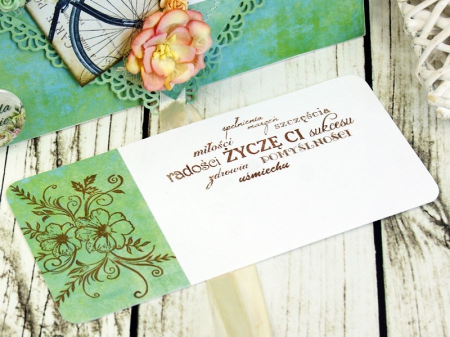 Elegancka kartka kopertówka wykonana z wysokiej jakości papierów do scrapbookingu, obszywana maszynowo. Kartka zdobiona papierowymi kwiatami oraz grafiką. W środku wkładka na życzenia z cytatem.