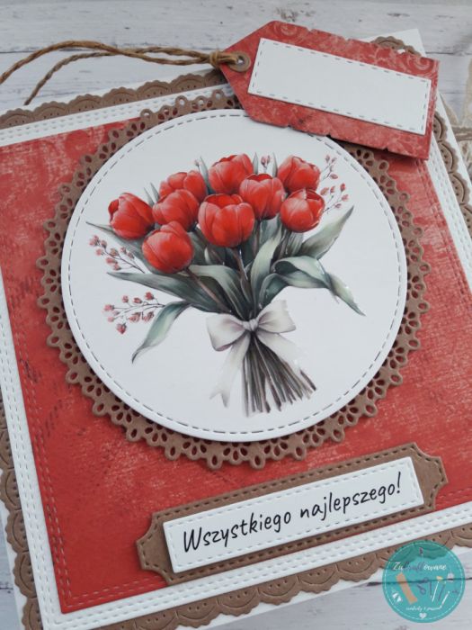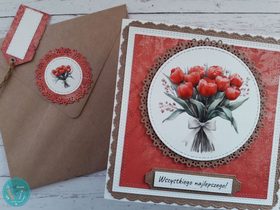 Ręcznie robiona kartka urodzinowa z czerwonymi tulipanami wykonana metodą scrapbookingu z wykorzystaniem profesjonalnych materiałów i z dbałością o każdy szczegół.
