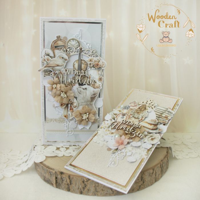 Przepiękna i delikatna kartka urodzinowa dla kobiety, utrzymana w odcieniach jasnej mięty, beżu i bieli, z dodatkiem srebrnych błyszczących akcentów, bogato zdobiona licznymi grafikami, udekorowana ręcznie robionymi, materiałowymi kwiatami, a także kryształkami, cekinami oraz tekturkowym napisem "W Dniu Urodzin" (do napisu mogę dodać imię solenizantki bądź całkowicie zmienić go na inny)