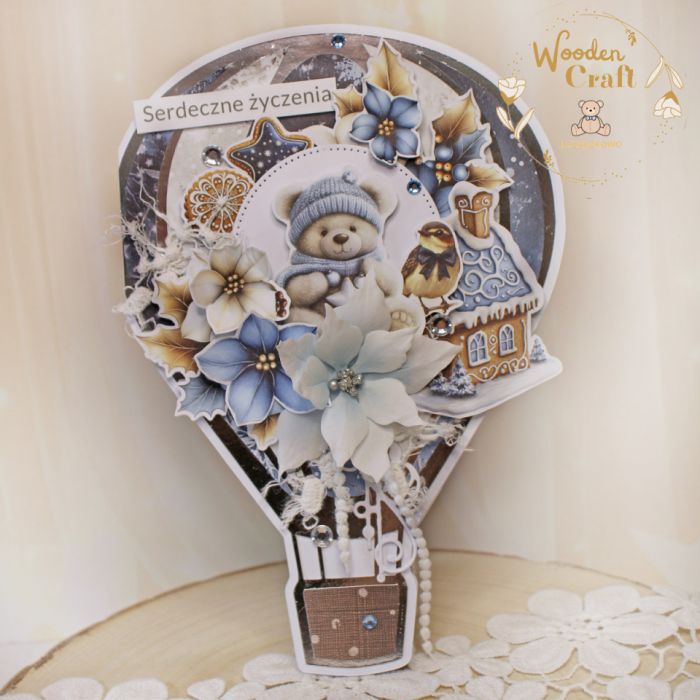 Jedyna w swoim rodzaju, bogato zdobiona kartka urodzinowa w kształcie balonika, utrzymana w zimowym klimacie, w odcieniach granatu, błękitu, beżu i bieli z dodatkiem srebrnych błyszczących akcentów. Kartka wykonana z prześlicznej, zimowej kolekcji papierów "Jolly Season". Kartka ozdobiona grafiką uroczego pluszowego misia, udekorowana ręcznie robioną, biało-niebieską poinsecją, koronkami, kryształkami, brokatem oraz napisem "Serdeczne Życzenia" (na życzenie napis mogę zmienić na dowolny, dopasowany do okazji).