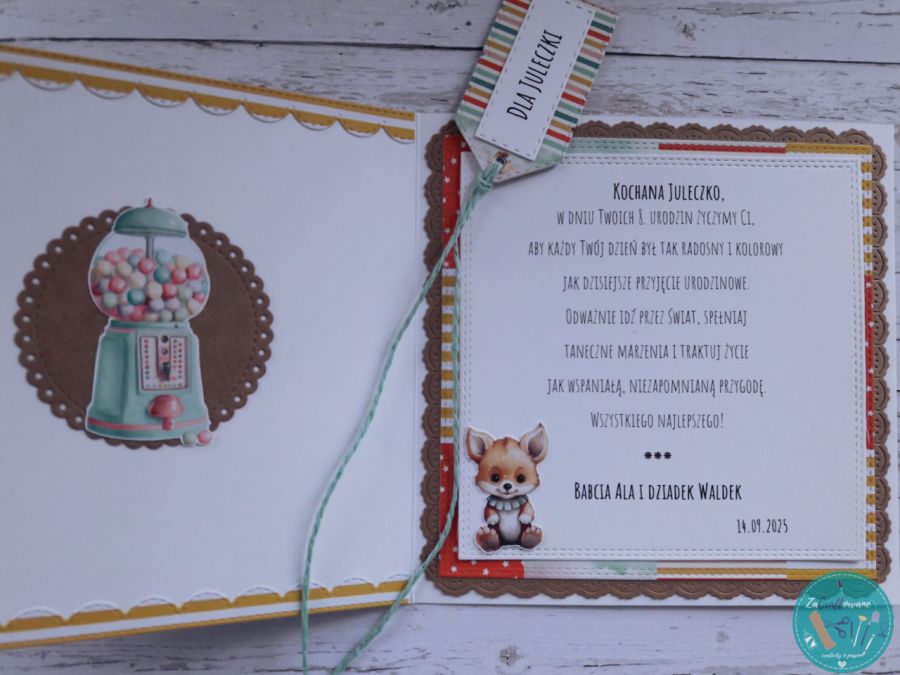 Do kartki dołączam GRATIS w postaci widocznej na zdjęciu etykietki, za pomocą której można podpisać upominek dla małej solenizantki bądź solenizanta obdarowywanego urodzinowym prezentem i przyczepić ją do wstążki, którą obwiązany jest podarunek, za pomocą sznureczka, który również znajduje się w zestawie.