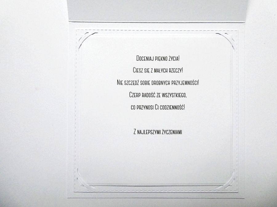 Kartka ma wklejony w środku biały karnecik do odręcznego wypisania kilku ciepłych słów.