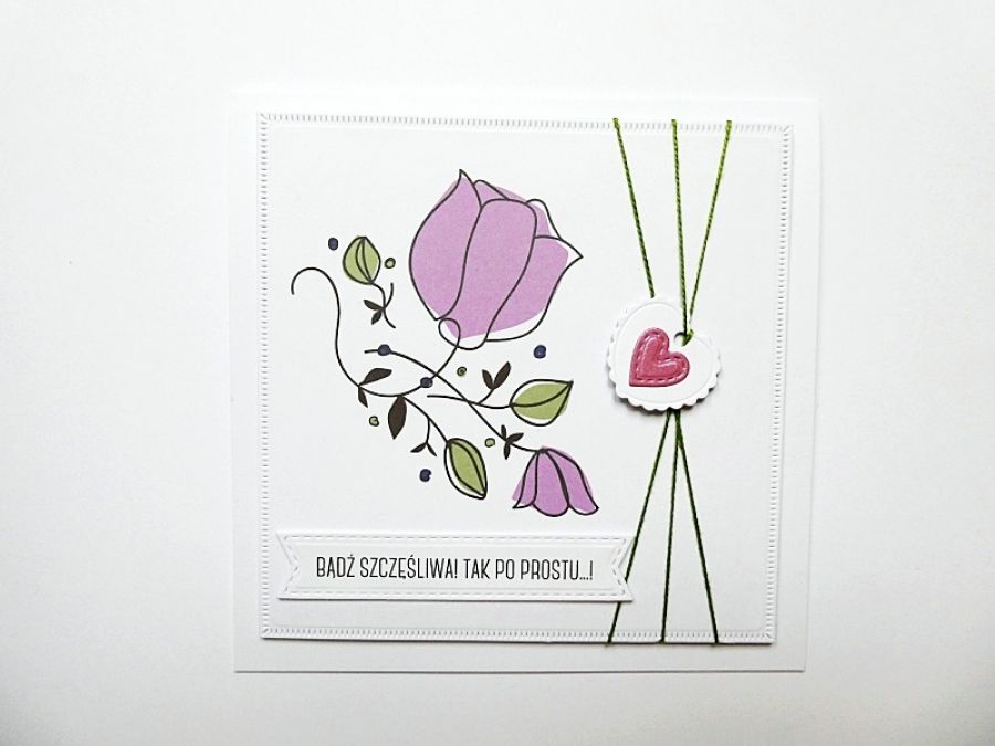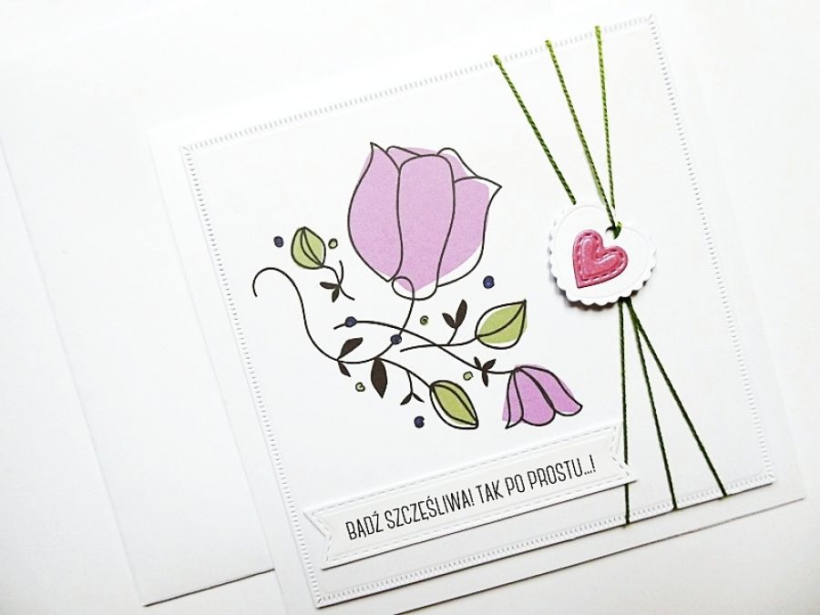 To prawdziwa kartka z duszą - ozdobiona nowoczesną grafiką, dekoracyjnym sznurkiem i zawieszką z motywem serca.