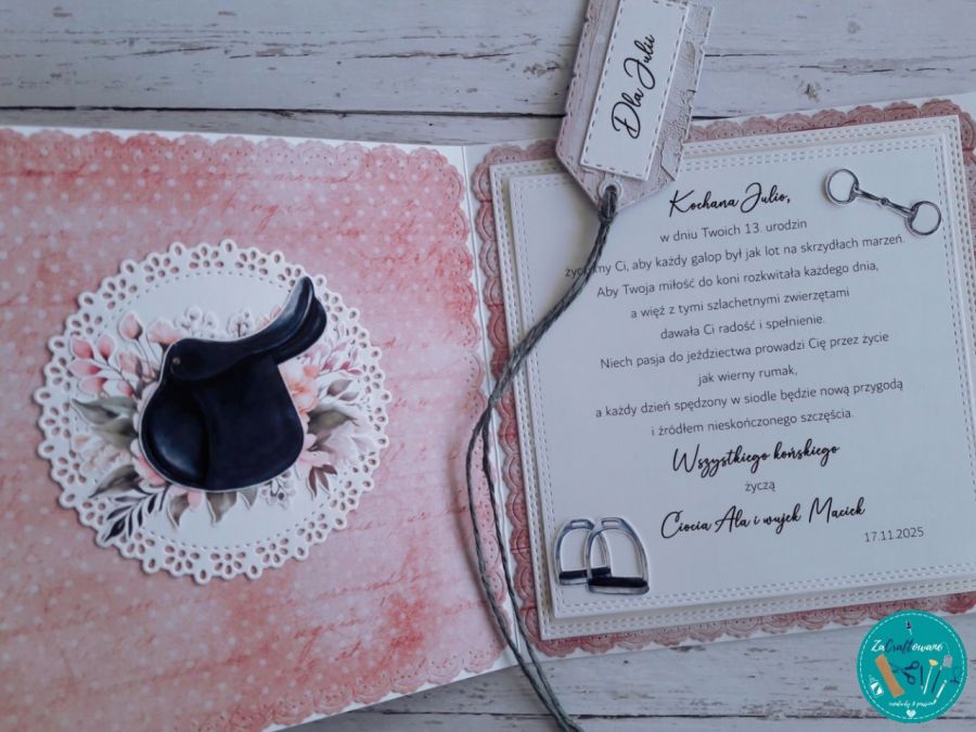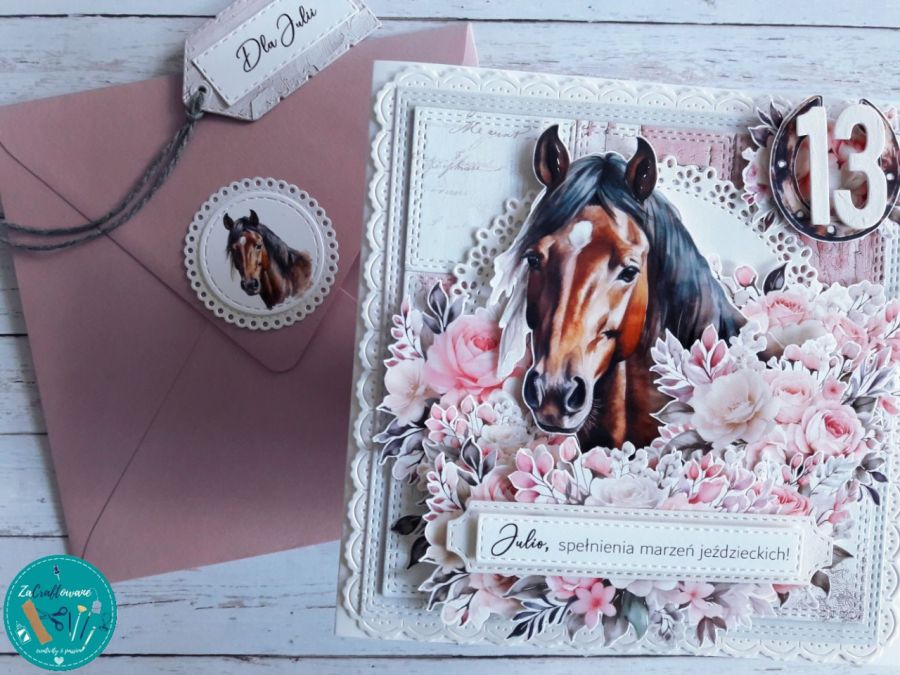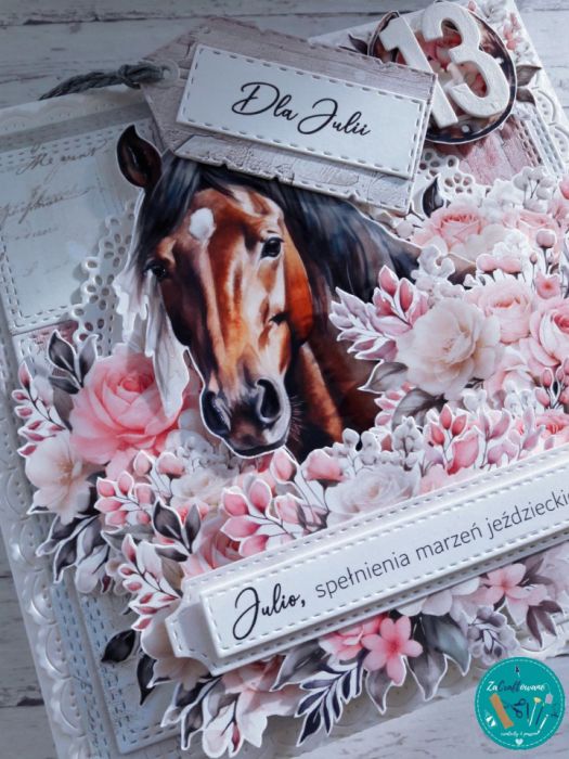 Warstwowa kartka urodzinowa dla pasjonatki koni z efektem 3D, wykonana metodą scrapbookingu.