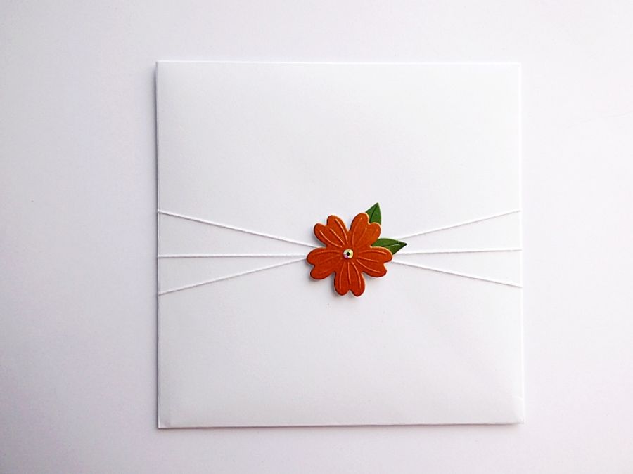W komplecie jest elegancka biała koperta o podwyższonej gramaturze. Koperta została dopasowana stylistycznie do kartki - przyozdobiona sznurkiem i papierowym kwiatkiem.