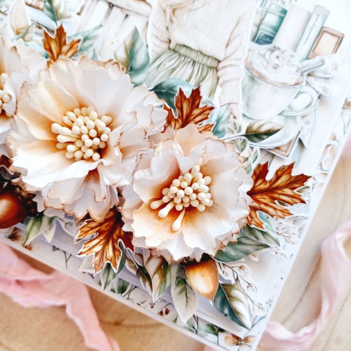 Przedstawiam ręcznie robioną kartkę okolicznościową o kwadratowym formacie, która urzeka przytulnym, jesiennym klimatem. To idealny prezent na Urodziny, Imieniny lub jako wyjątkowe podziękowanie. Kompozycja wykonana techniką scrapbooking przedstawia urokliwy, ciepły zakątek z książkami, gorącym napojem i postacią kobiety. Przestrzenny bukiet z ręcznie formowanych kwiatów w beżowo-brązowej tonacji oraz motywy liści dębu dodają całości głębi i ekskluzywnego charakteru. Odkryj to unikatowe rękodzieło na Artillo.