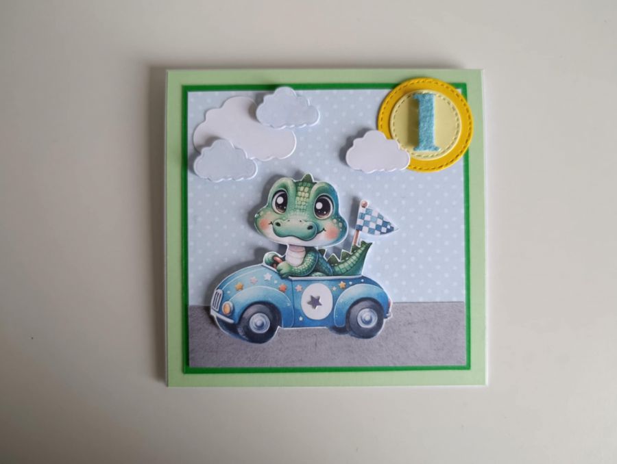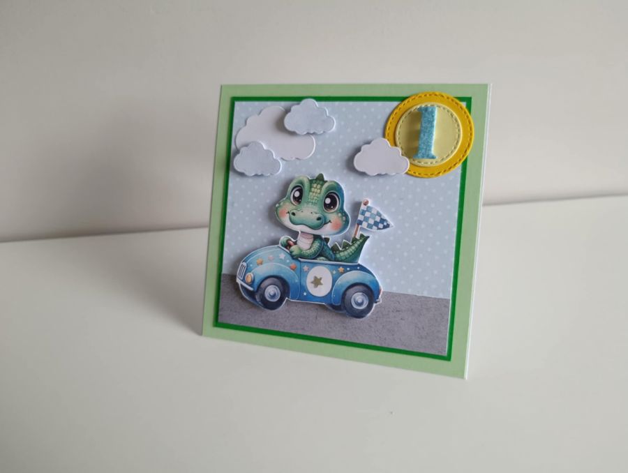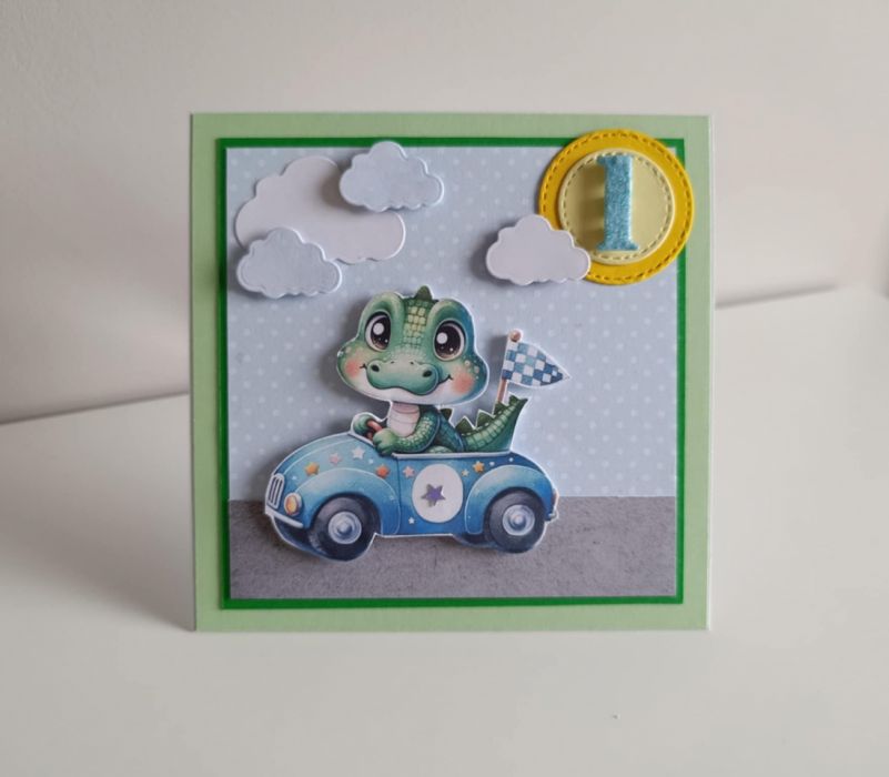 Nazwa produktu: Kartka urodzinowa na roczek krokodyl w aucie