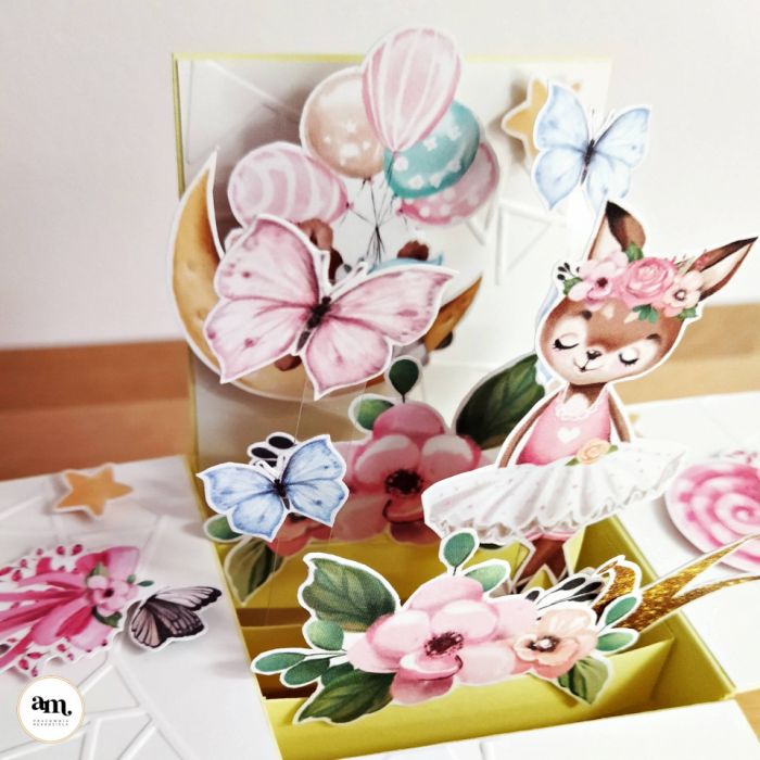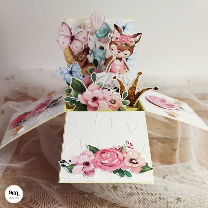 Przedstawiam Wam urodzinową kartkę pop up box dla małej baletnicy. Kartka utrzymana w ciepłych kolorach z przewagą różu z tłoczonym wzorem girland.