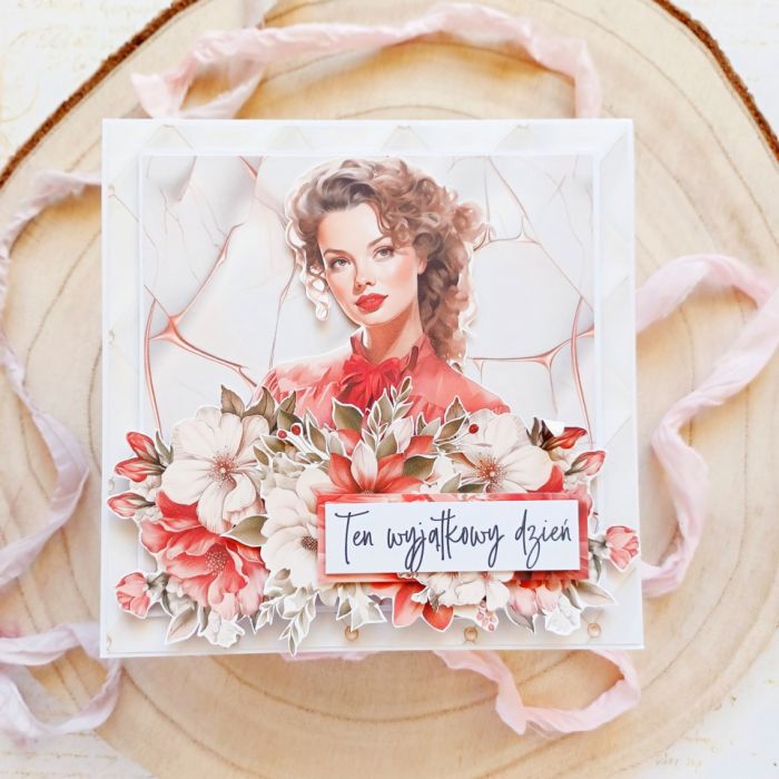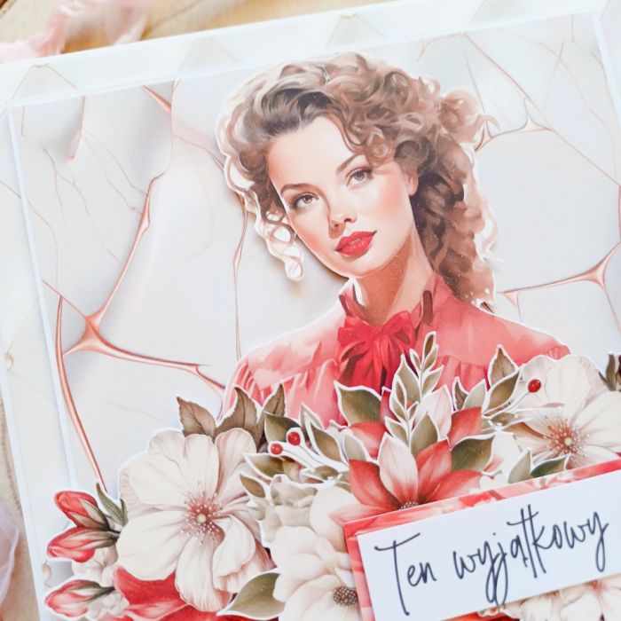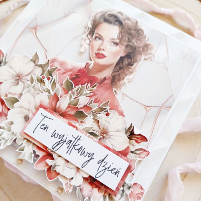 Przedstawiam ręcznie robioną kartkę okolicznościową o kwadratowym formacie, która jest wyrazem elegancji i kobiecej siły. Idealna na Dzień Kobiet, Urodziny lub Imieniny. Projekt z pięknym, wyrazistym portretem utrzymany jest w odważnej palecie bieli, kremu i intensywnej czerwieni. Przestrzenna kompozycja kwiatowa w technice scrapbooking oraz napis "Ten wyjątkowy dzień" sprawiają, że to ekskluzywna i niezapomniana pamiątka. To unikatowe rękodzieło znajdziesz w butiku na Artillo.