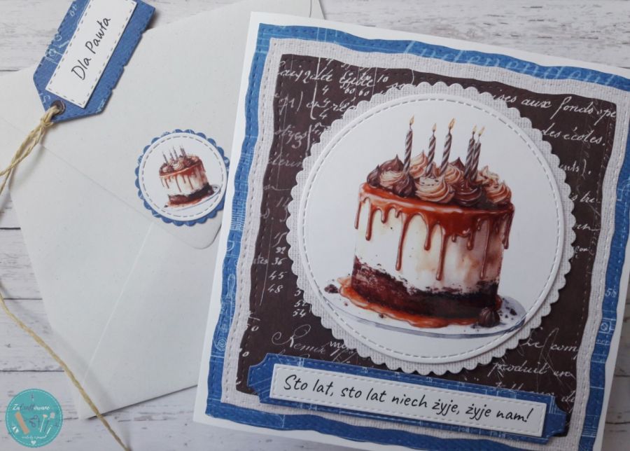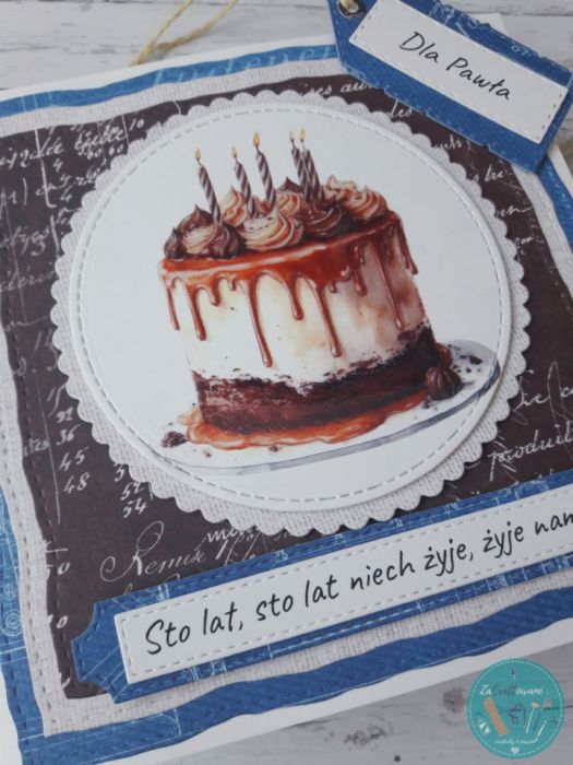 Męska kartka urodzinowa z tortem wykonana metodą scrapbookingu z wykorzystaniem profesjonalnych materiałów i z dbałością o każdy szczegół.