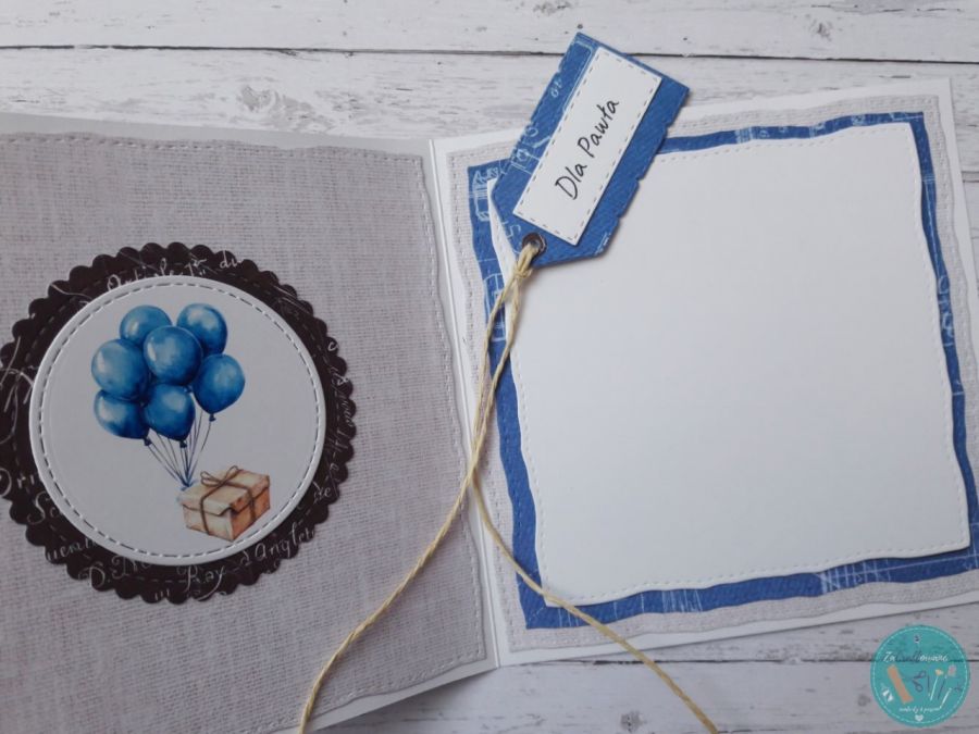 Do kartki dołączam GRATIS w postaci widocznej na zdjęciu etykietki, za pomocą której można podpisać upominek urodzinowy i przyczepić ją do wstążki, którą obwiązany jest prezent, za pomocą sznureczka, który również znajduje się w zestawie.