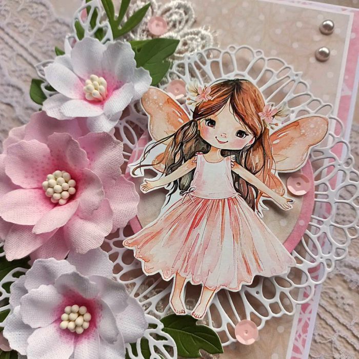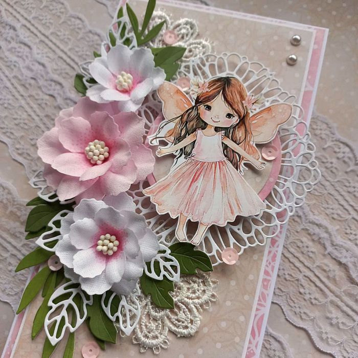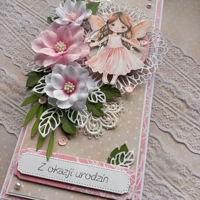 Urodzinowa kartka dla dziewczynki z ilustracją wróżki i ręcznie robionymi kwiatuszkami z usztywnionej bawełny. Kompozycje uzupełniają zielone i białe listki oraz serwatka papierowa, elementy koronkowe i napis "Z okazji urodzin". Wewnątrz miejsce na życzenia. Do kartki, w cenie, dołączone białe pudełko z okienkiem.