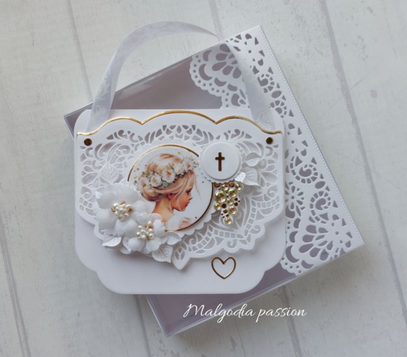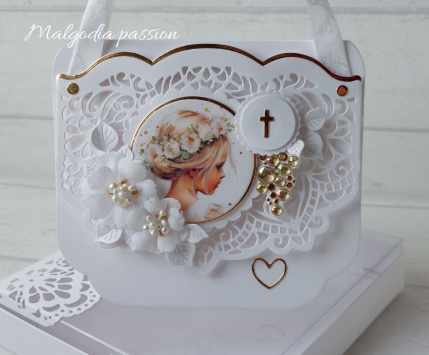 Niepowtarzalna, składana kartka gratulacyjna z okazji Pierwszej Komunii Świętej w kształcie torebki w oryginalnym pudełeczku z przeźroczystą pokrywką. Autorski projekt produktu. Kartka jest ozdobiona ręcznie robionymi kwiatkami i obrazkiem z uroczą dziewczynką. Wykonana z dokładnością i starannością o szczegóły z wysokiej jakości papierów w bieli z odrobiną złota. Wewnątrz znajduje się miejsce na wpis życzeń. Torebeczka posiada uchwyt ze wstążeczki . Wyjątkowa, jedyna w swoim rodzaju pamiątka . Zapraszam serdecznie :)