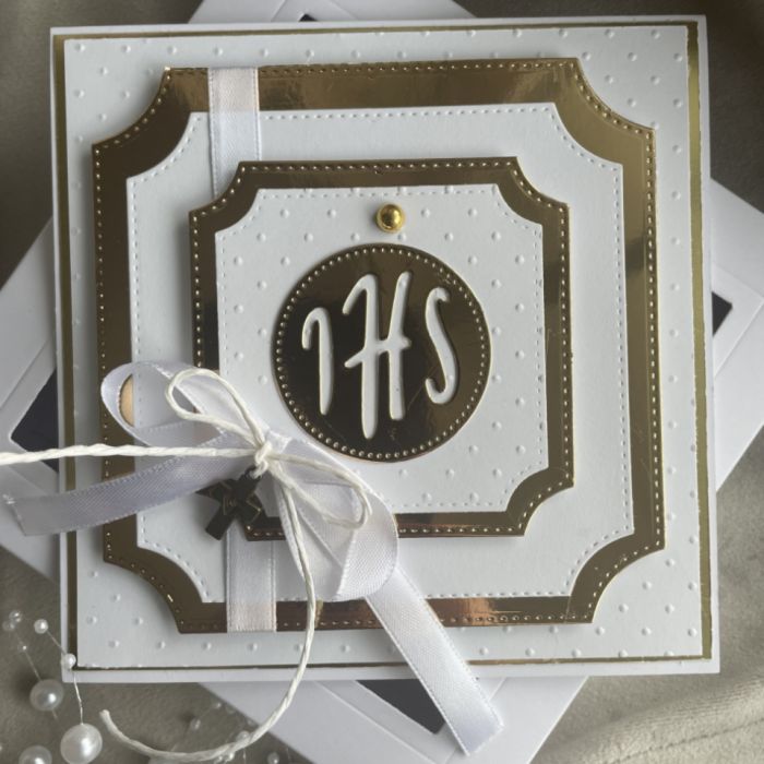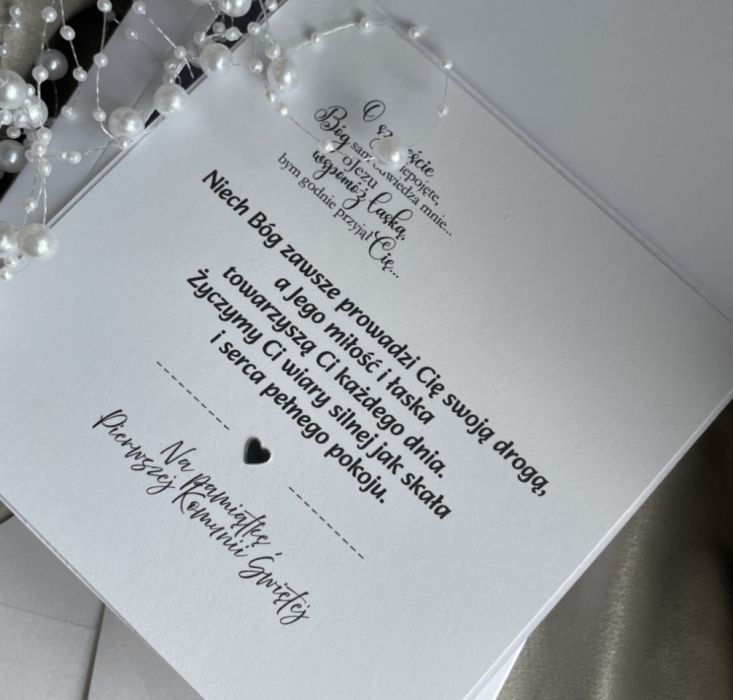 Ręcznie robiona kartka komunijna w eleganckim, białym pudełku z kokardą to wyjątkowy zestaw, który idealnie sprawdzi się jako pamiątka Pierwszej Komunii Świętej. Całość wykonana jest z najwyższą starannością, z użyciem wysokiej jakości papierów oraz delikatnych, złotych motywów komunijnych, które nadają projektowi nowoczesnej elegancji.