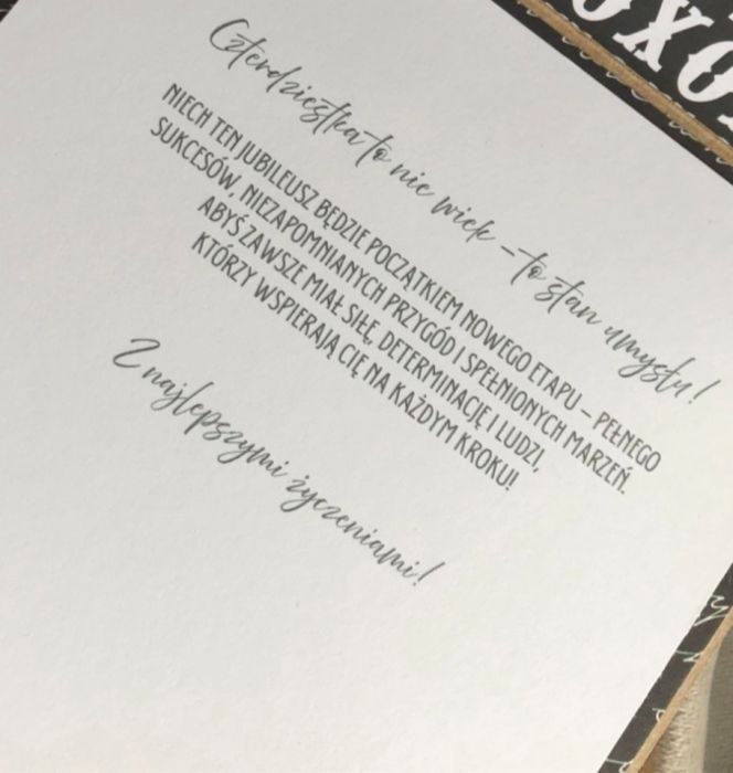 Istnieje możliwość dostosowania tekstu życzeń do indywidualnych potrzeb oraz zmiany cyfry na froncie kartki na dowolny jubileusz.