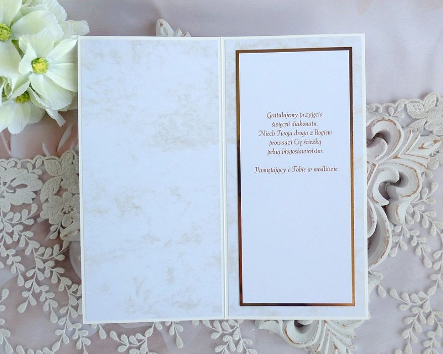 Warstwowa pamiątka z okazji Święceń Diakonatu, ozdobiona pięknymi papierami perłowymi polskiego producenta, laserowo wycinanymi tekturkami oraz kwiatami.