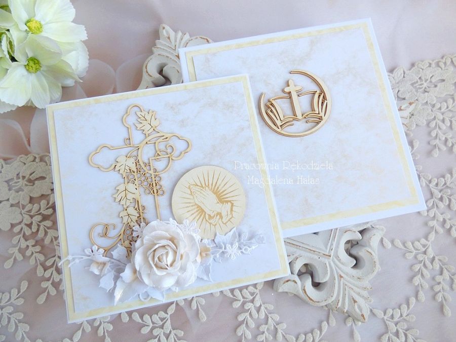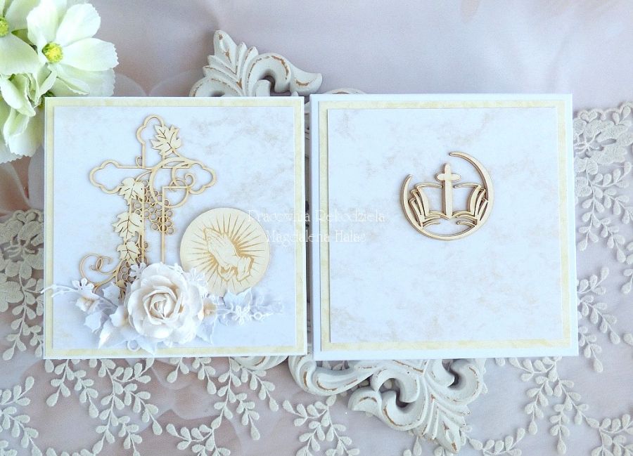 Warstwowa pamiątka z okazji Święceń Diakonatu, ozdobiona pięknymi papierami perłowymi polskiego producenta, laserowo wycinanymi tekturkami oraz kwiatami.