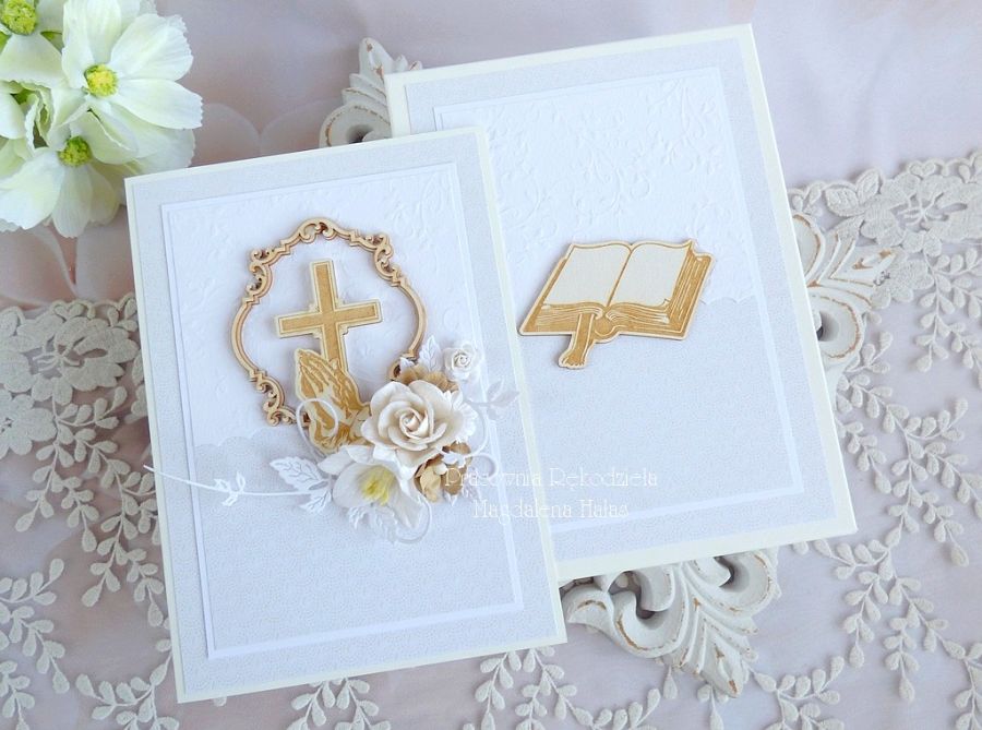Warstwowa pamiątka z okazji Święceń Diakonatu, ozdobiona pięknymi papierami scrapowymi polskich producentów, laserowo wycinanymi tekturkami oraz kwiatami.