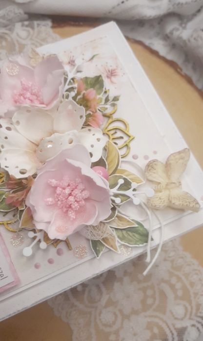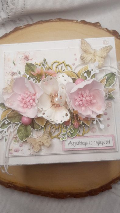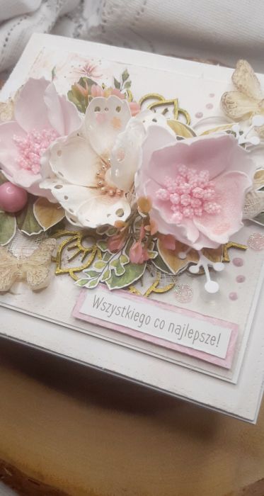 Kartka okolicznościowa do pudełka. Kartka jest bogato zdobiona kwiatami i innymi dodatkami. W środku kartka na życzenia podklejona taśmą dwustronną. Wymiary kartki 14x14 cm. W zestawie z pudełkiem o wymiarach 14,5x14x5x3 cm.