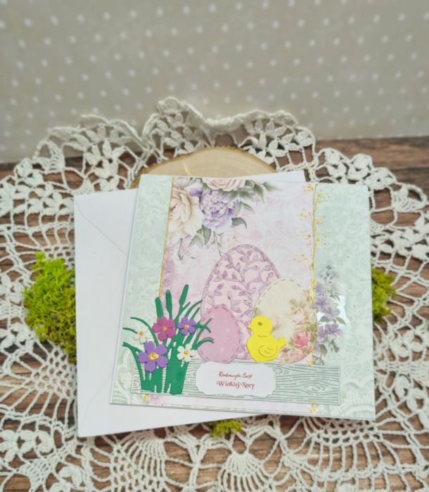 Kartka wielkanocna wykonana w całości ręcznie z dbałością o każdy detal. Delikatna, wiosenna kompozycja z motywem pisanek, żółtych kurczaczków i subtelnych kwiatów