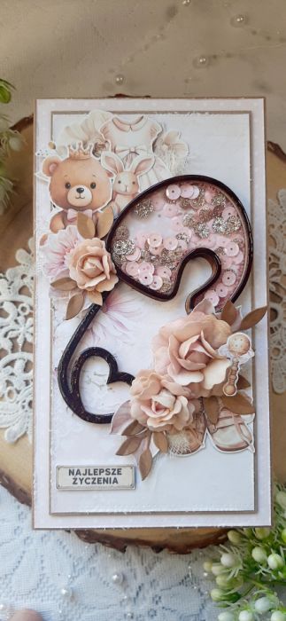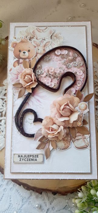 Kartka okolicznościowa do pudełkana bazie kraftowej. Kartka jest bogato zdobiona kwiatami i innymi dodatkami znajduje się na niej shaker. W środku kartka na życzenia podklejona taśmą dwustronną. Wymiary kartki 20,5x10 cm. W zestawie z pudełkiem kraftowym o wymiarach 21x10,5x3 cm.