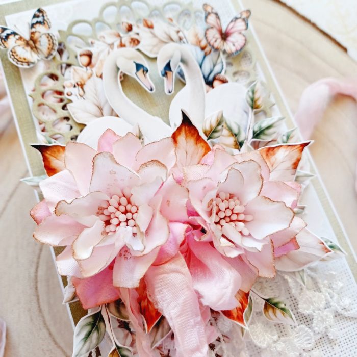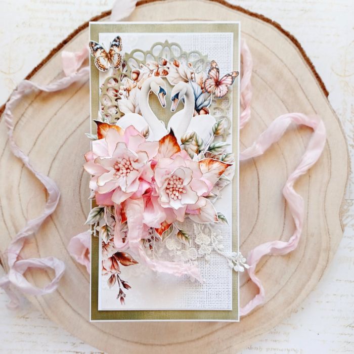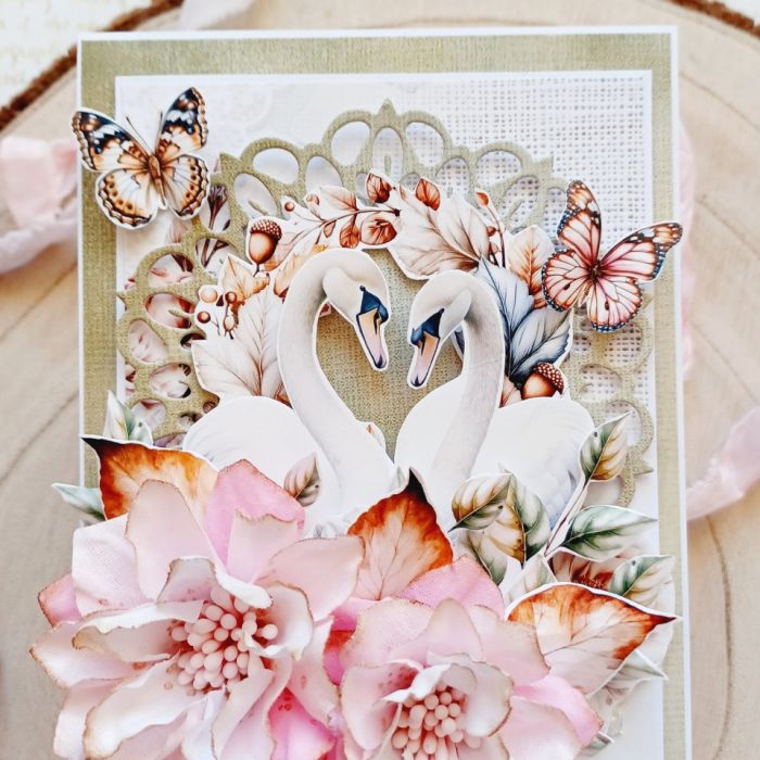 Odkryj wyjątkową, ręcznie robioną kartkę okolicznościową z motywem pary łabędzi, symbolizujących wieczną miłość i wierność. To idealna propozycja na rocznicę ślubu (szczególnie "Łabędzią" – 7 lat!) lub jako ekskluzywna kartka ślubna. Kompozycja, wykonana techniką scrapbooking, utrzymana jest w delikatnych odcieniach pudrowego różu i beżu. Efekt 3D tworzą przestrzenne kwiaty i motyle, nadając całości elegancji i lekkości. Znajdź ten unikat na Artillo.