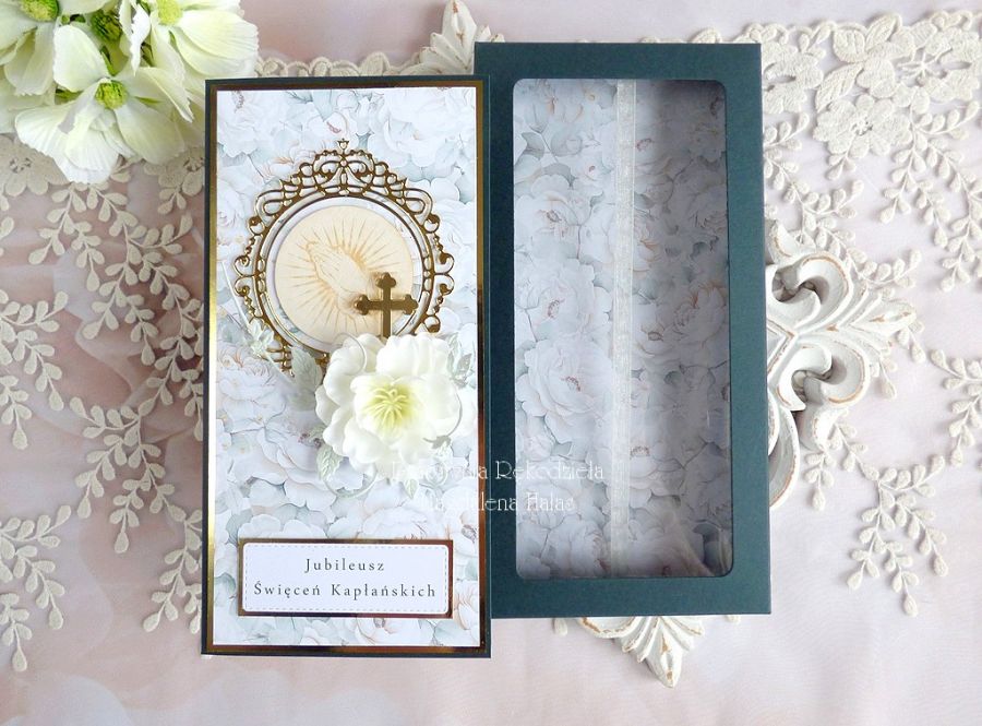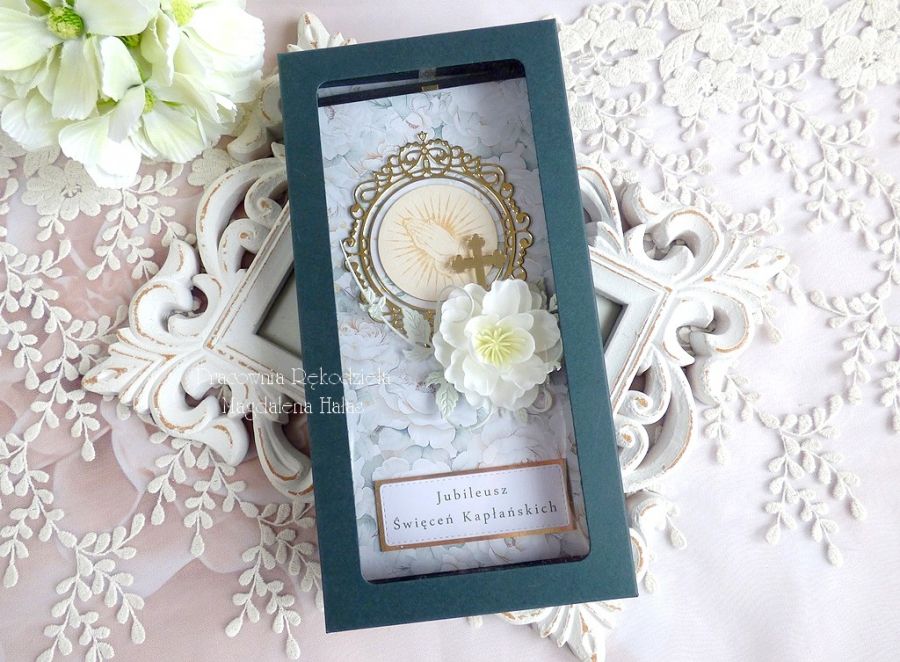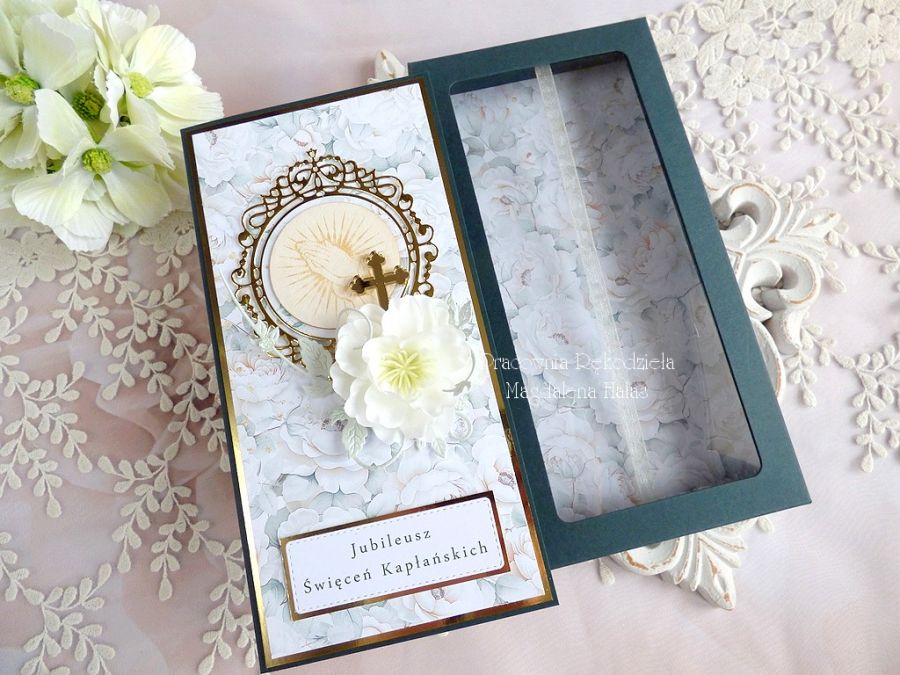 Warstwowa pamiątka z okazji Jubileuszu Kapłaństwa ozdobiona pięknymi papierami scrapowymi polskich producentów, grawerowaną tekturką, kompozycją kwiatową, dekorami z lustrzanego złota oraz innymi dodatkami.