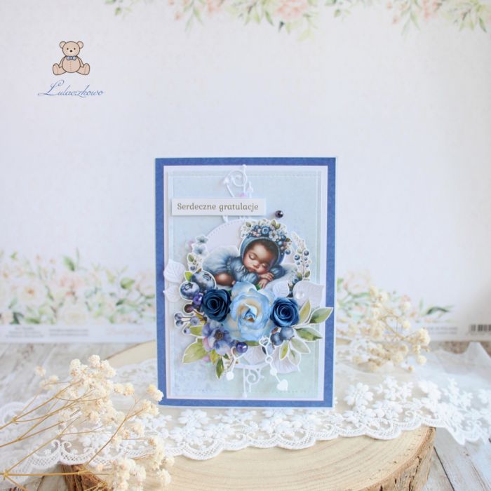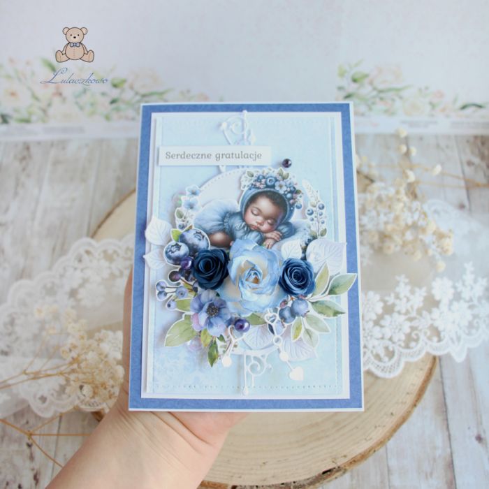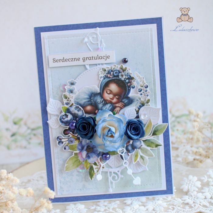 Przepiękna kartka na chrzest lub narodziny dziecka, z motywem jagód utrzymana w odcieniach granatu i błękitu. Kartka wykonana ręcznie z dbałością o każdy szczegół, z miksu kolekcji papierów, z grafiką śpiącego maluszka w przebraniu jagódki. Całość ozdobiona kompozycją kwiatową z grafikami soczystych jagód i papierowych kwiatów oraz napisem "Serdeczne gratulacje" (na życzenie mogę go zmienić na dowolny, również z okazji chrztu).