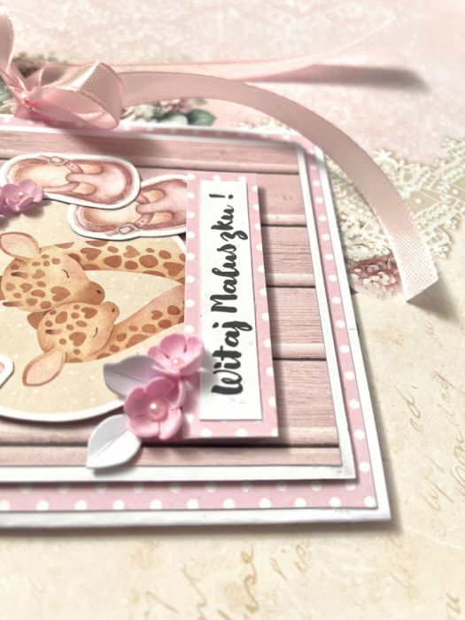 Ręcznie wykonana kartka z okazji narodzin córeczki. Ozdobiona uroczym dziecięcym drewienkiem. Kolorystyka w odcieniach różu.