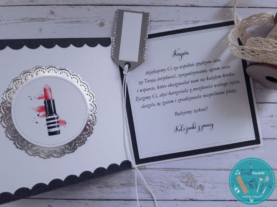 Tył i wnętrze kartki także zostały ozdobione. Kartka jest wykończona preparatem szklącym.