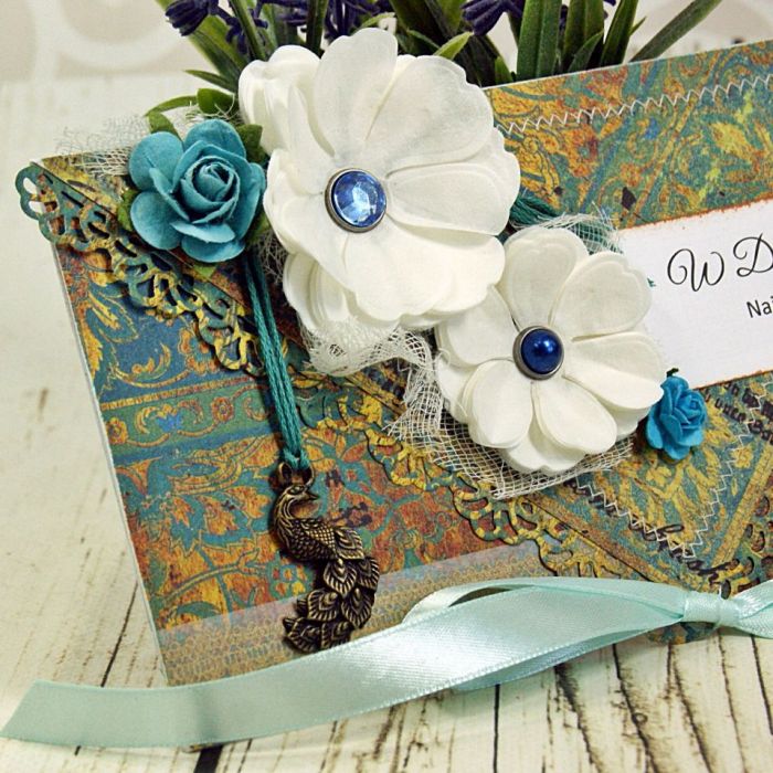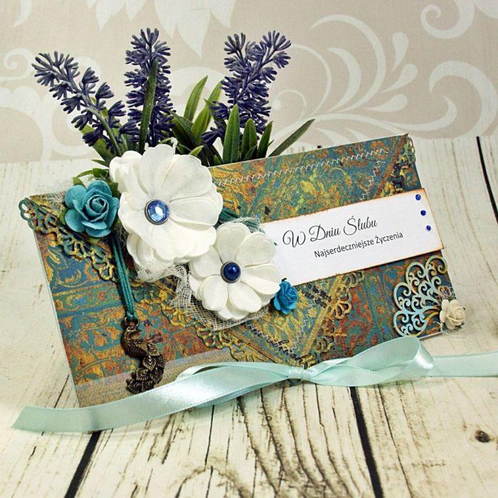 Elegancka kartka kopertówka wykonana z wysokiej jakości papierów do scrapbookingu, obszywana maszynowo. Kartka zdobiona papierowymi kwiatami oraz zawieszką pawiem. W środku wkładka na życzenia.