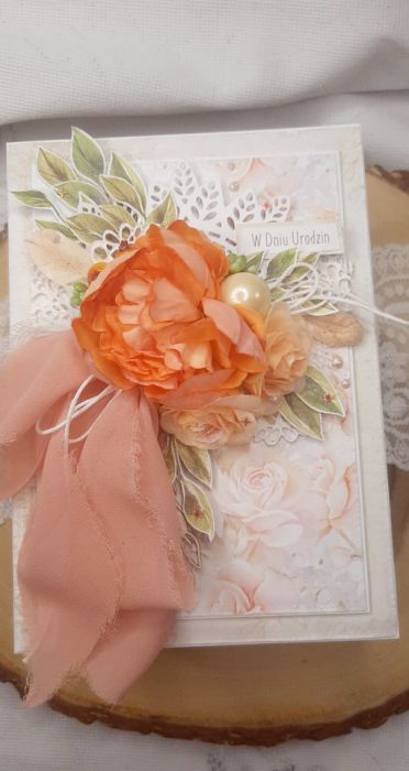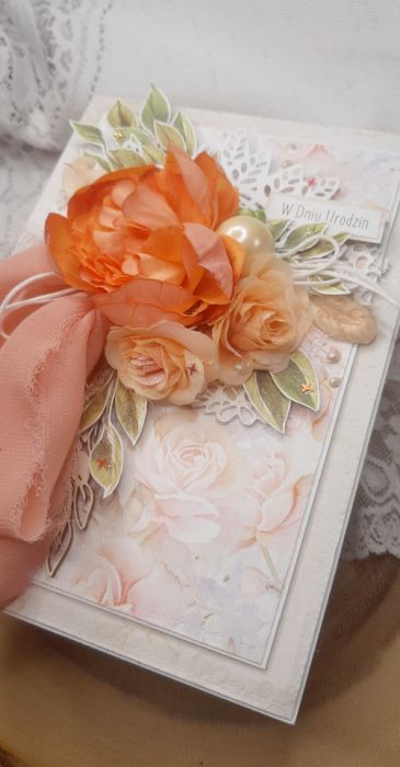 Kartka okolicznościowa do pudełka. Kartka jest bogato zdobiona kwiatami i innymi dodatkami. W środku kartka na życzenia podklejona taśmą dwustronną. Wymiary kartki 18x13 cm. W zestawie z pudełkiem o wymiarach 18,5x13,7x3 cm.
