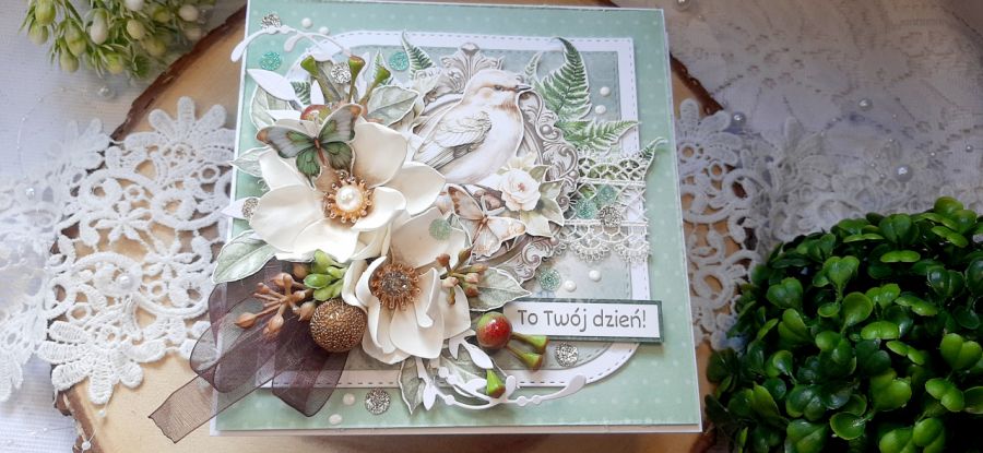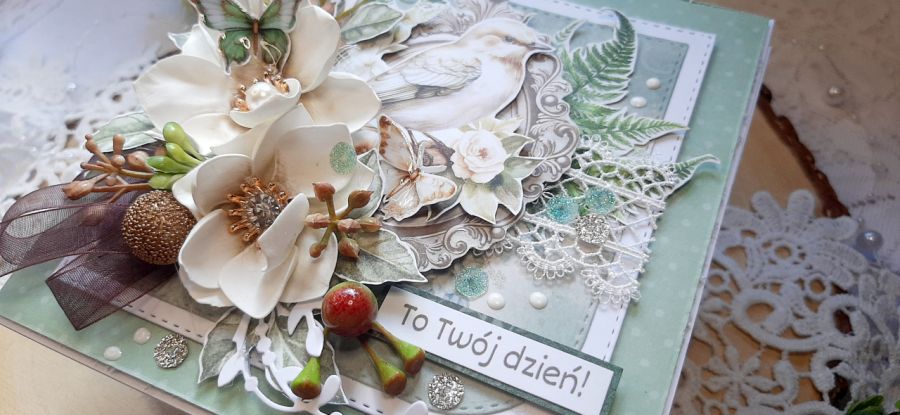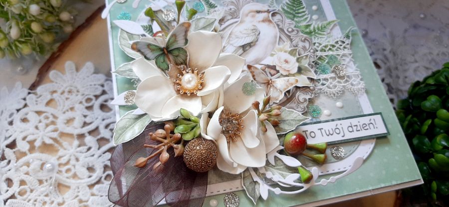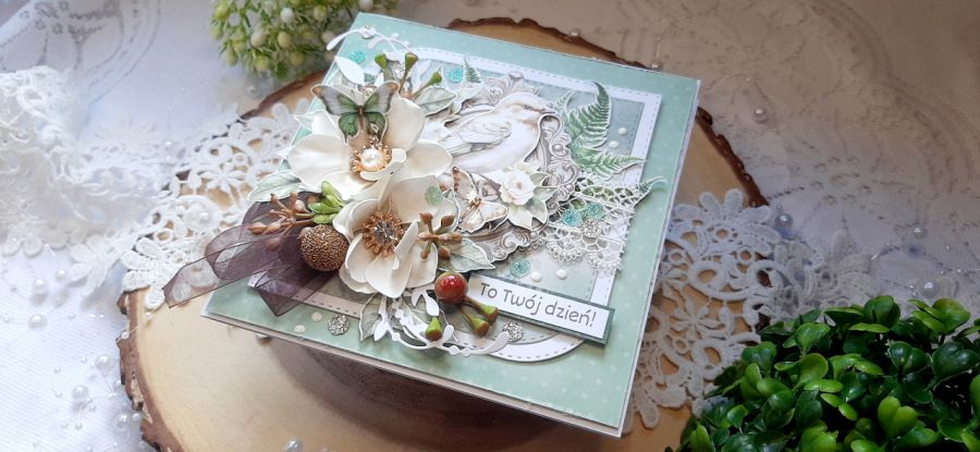 Kartka okolicznościowa do pudełka. Kartka jest bogato zdobiona kwiatami i innymi dodatkami. W środku kartka na życzenia podklejona taśmą dwustronną. Wymiary kartki 14x14 cm. W zestawie z pudełkiem o wymiarach 14,5x14x5x3 cm.
