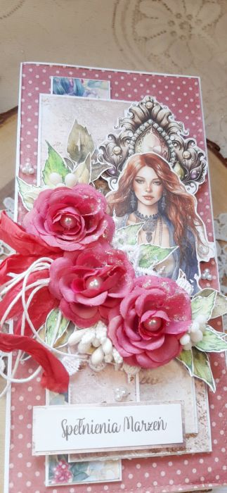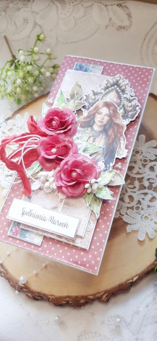 Kartka okolicznościowa do pudełka. Kartka jest bogato zdobiona kwiatami i innymi dodatkami. W środku kartka na życzenia podklejona taśmą dwustronną. Wymiary kartki 20,5x10 cm. W zestawie z pudełkiem o wymiarach 21x10,5x3 cm.