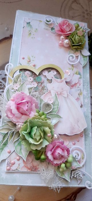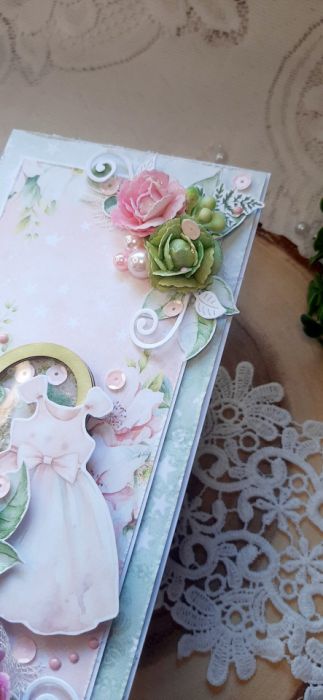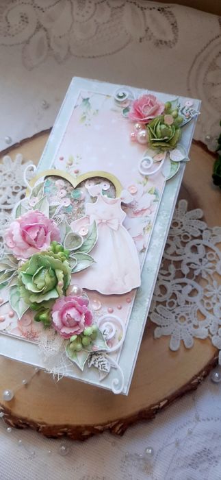 Kartka okolicznościowa do pudełkana. Kartka jest bogato zdobiona kwiatami i innymi dodatkami znajduje się na niej shaker. W środku kartka na życzenia podklejona taśmą dwustronną. Wymiary kartki 20,5x10 cm. W zestawie z pudełkiem o wymiarach 21x10,5x3 cm.