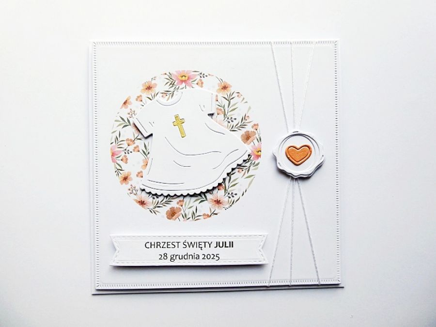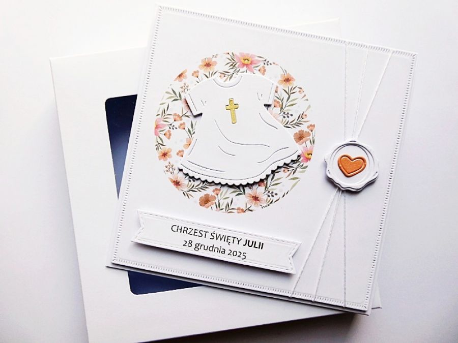 Wycięta z papieru biała szatka podkreśla sakralny charakter uroczystości, a dekoracyjny sznureczek ozdobiony pieczęcią z sercem dodaje pamiątce uroku.
