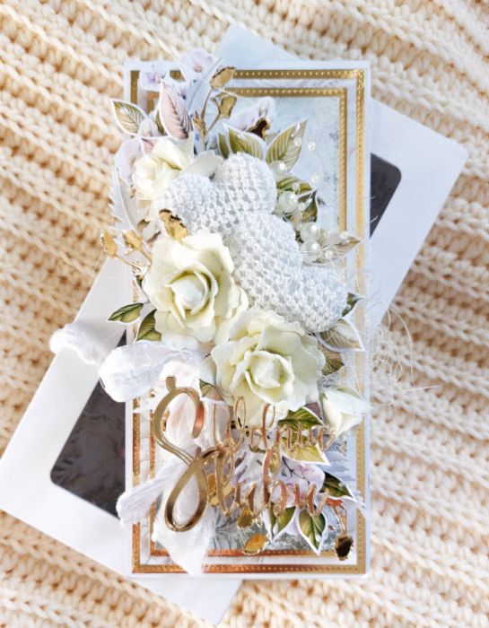 Niezwykle elegancka i oryginalna kartka ślubna, której główną ozdobą są dwa, ręcznie dziergane, szydełkowe serca, ktore tworzą piękną kompozycję. Uzupełniają ją ręcznie wykonane róże z foamiranu, złoty, błyszczący napis plexi, także dodatki, dzięki czemu kartka jest delikatna i bardzo dobrze odzwierciedla charakter uroczystości ślubnej. W środku znajduje się miejsce na wpisanie życzeń. Kartka stanowi komplet z białym pudełkiem, dzięki czemu mamy samodzielny i oryginalny prezent na ślub, którego nikt nie powieli :)