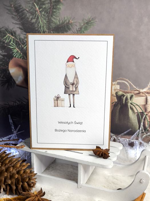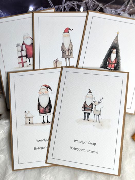 Kazda kartka została zaprojektowana i wykonana ręcznie, z akwarelową grafiką Mikołaja w różnych scenkach - z prezentami, choinką, reniferem czy domkiem.