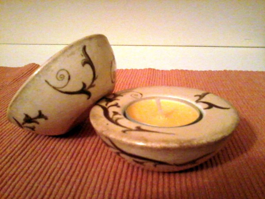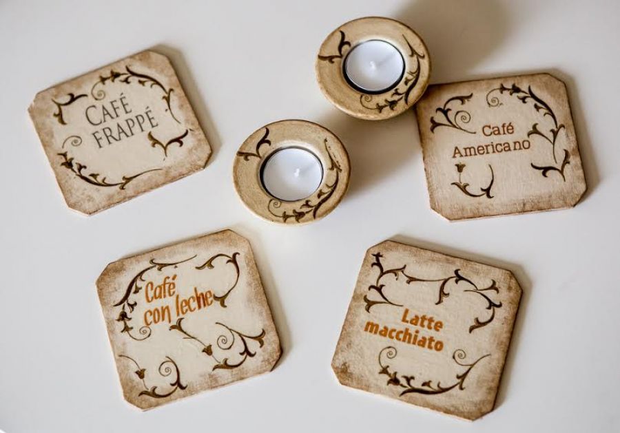 Polecam komplet składający się z dwóch szklanych świeczników i czterech drewnianych podkładek pod kubki/szklanki/filiżanki zdobiony ręcznie metodą decoupage, specjalnie postarzany.