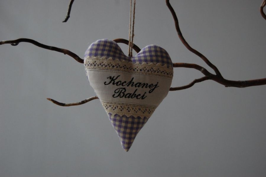 Zawieszka - serce - wykonana z tkaniny w lawendową krateczkę, pośrodku bawełniana wstawka w kolorze ecri z wyhaftowanym napisem "Kochanej Babci", z góry i dołu obszyta bawełnianą koronką. W środku serduszka wypełnienie poduszkowe. Pętelka do zawieszenia wykonana ze sznura jutowego.