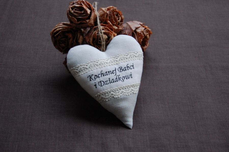 Zawieszka - serce - wykonana z naturalnego lnu, pośrodku bawełniana wstawka z wyhaftowanym napisem "Kochanej Babci i Dziadkowi", z góry i dołu obszyta bawełnianą koronką. W środku serduszka wypełnienie poduszkowe. Pętelka do zawieszenia wykonana ze sznura jutowego.